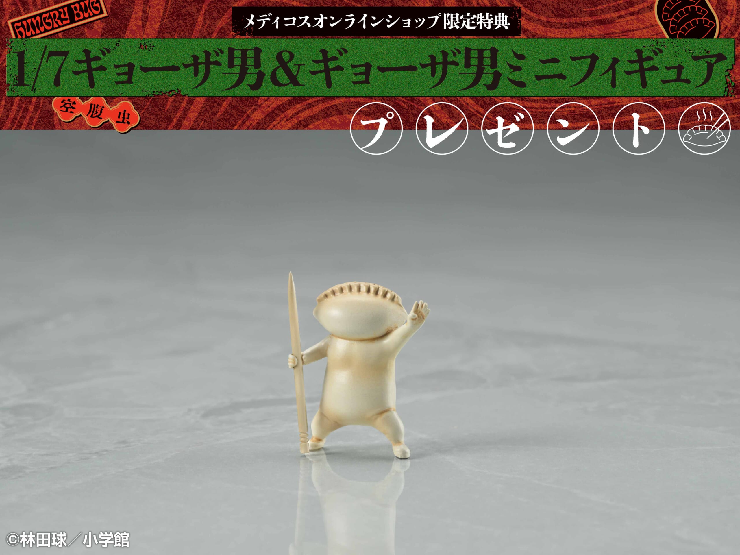 こんがりと焼きあがったギョーザ、左手に持つギョーザ返し、腕の「空腹虫(ハングリーバグ)」のロゴなど、細部のディテールにも見所が満載です。