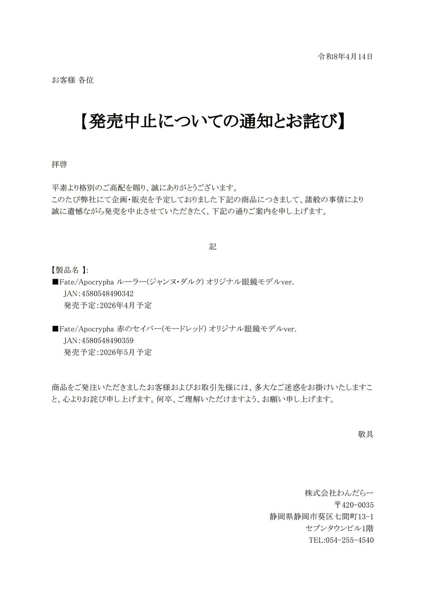 ■わんだらーより発売中止が告知