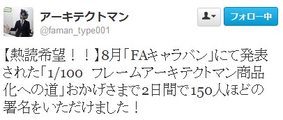 「1/100 フレームアーキテクトマン商品化への道」おかげさまで2日間で150人ほどの署名をいただけました!