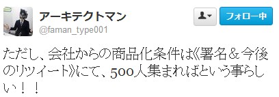 ただし、会社からの商品化条件は《署名&今後のリツイート》にて、500人集まればという事らしい!!