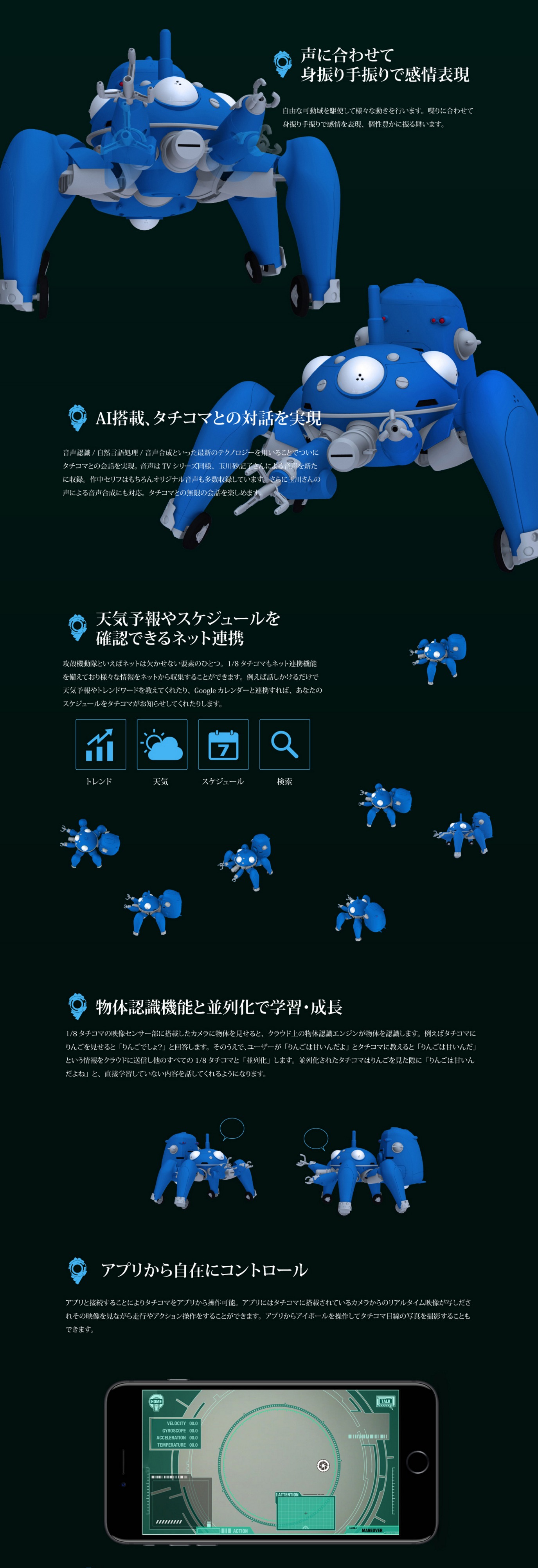 攻殻機動隊関連製品として初となる※、各関節・ポッド・マニピュレータ・車輪の電動可動を実現。
