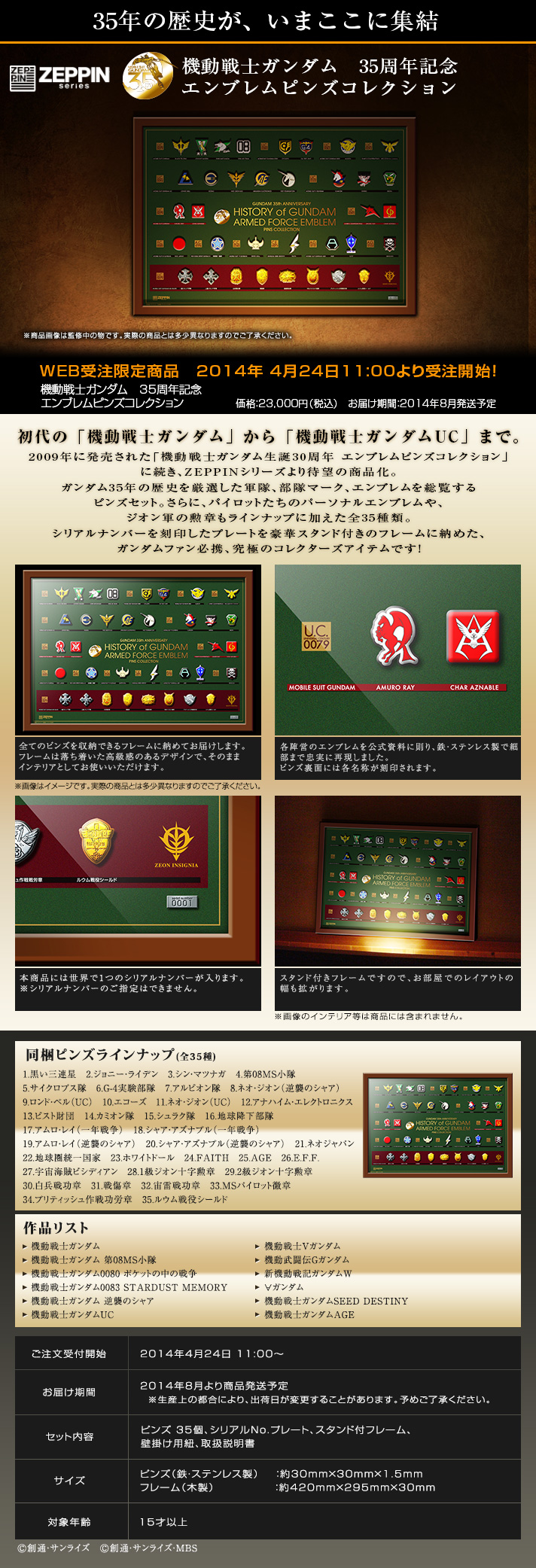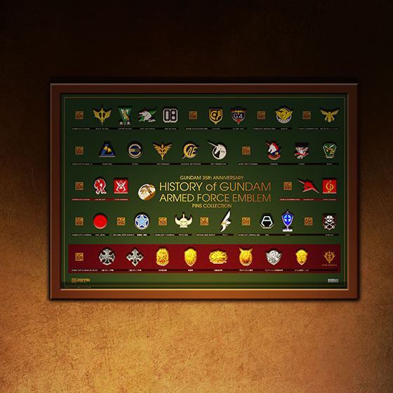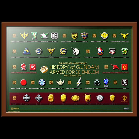 ガンダム35年の歴史より厳選した軍隊、部隊マーク、エンブレムを総覧するピンズセットです。