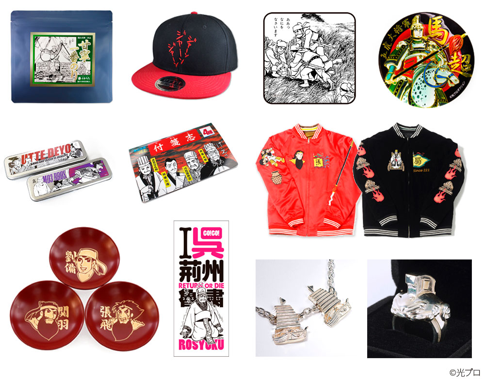 iPhone用ソフトケース(全5種)各¥2,980/手帳型スマホケース(全2種)各¥3,200/ダイカットアクリルキーホルダー各¥900/饅頭マスコット¥1,200/湯のみ・マグカップ各¥1,500/二頭の牛B2タペストリー¥3,000/温州蜜柑ミニポスター¥500/甘寧一番のりミニポスター ¥500/トートヌのトートバック¥2,000/武将なりきり下敷き(全2種)各¥600/刑道栄Tシャツ ¥3,500/UMUの人Tシャツ ¥3,500/三国志イラストバックパック ¥7,000/缶バッジ(全13種)各¥300/漢字ドリル「答教」¥1,000/下げ札シール(劉備)¥600/金箔入り焼酎「桃園の誓い」¥2,000/カード型モバイルバッテリー3種 各2,980円