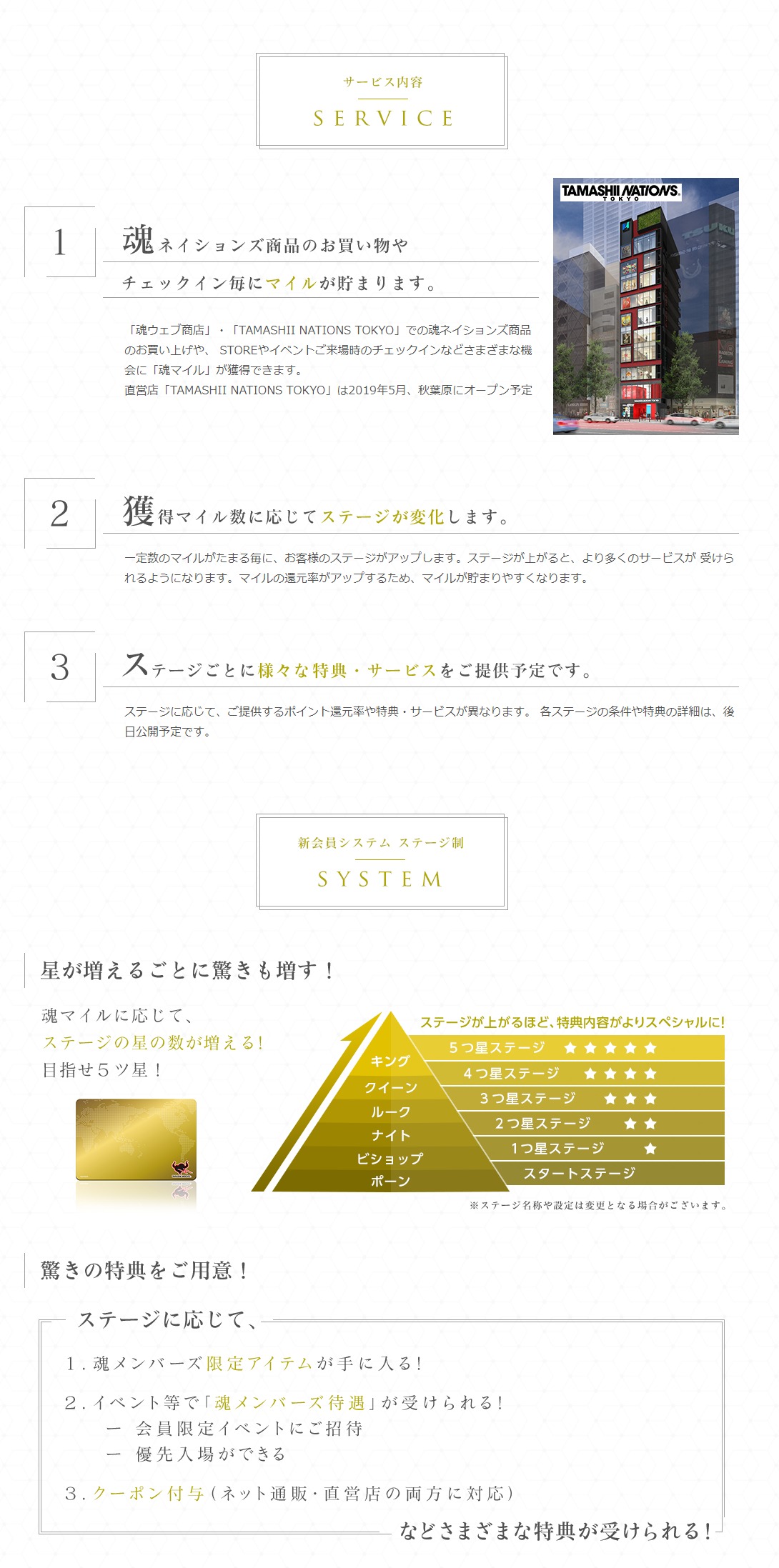 【バンダイコレクターズ】マイレージ制度「CLUB TAMASHII MEMBERS」事前登録受付開始 2017年12月02日 13:51 Newsロボ魂/フィギュアーツ|CM() 魂ネイション会員 ■バンダイコレクターズ事業部 マイレージ制度 「CLUB TAMASHII MEMBERS」事前登録受付開始 ・マイルが貯まる ・獲得マイルに応じてステージランクが上がるなど変化 ・ランクに応じて限定アイテムやクーポンが貰える 限定イベント企画やイベント優先入場など特典あり 直営店「TAMASHII NATIONS TOKYO」は2019年5月、秋葉原にオープン予定 魂ネイションズ マイレージ制会員制度「CLUB TAMASHII MEMBERS」事前登録受付開始! 特設ページを公開! ▽受付や詳細は下リンク先の公式サイトにて club.tamashii.jp/