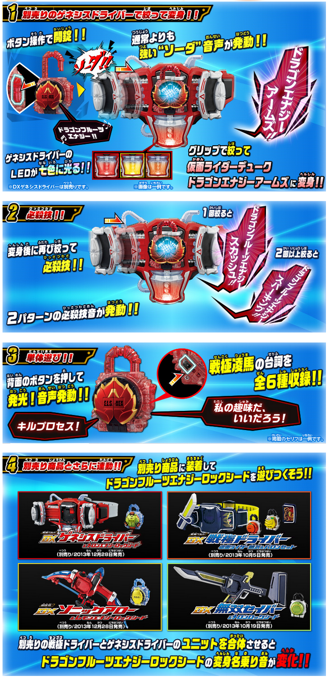 別売りの「DXゲネシスドライバー」に装着することで、劇中で使用されている必殺技音や台詞が流れ、