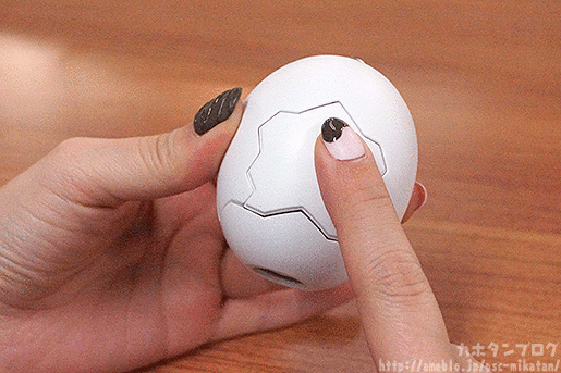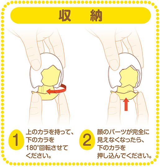 ぴよくるは、内蔵しているバネにより卵型から人型にワンタッチ変形する構造を持っている新感覚カプセルトイです。