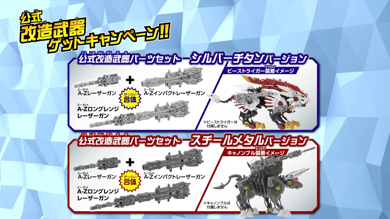 【ゾイドワイルド】改造武器パーツセット「シルバーチタンバージョン」「スチールメタルバージョン」【明日27日より配布開始】 2019年07月26日 17:01 ゾイドキャンペーンゾイドワイルド コメ 【明日27日より配布開始】 この記事の続きを読む