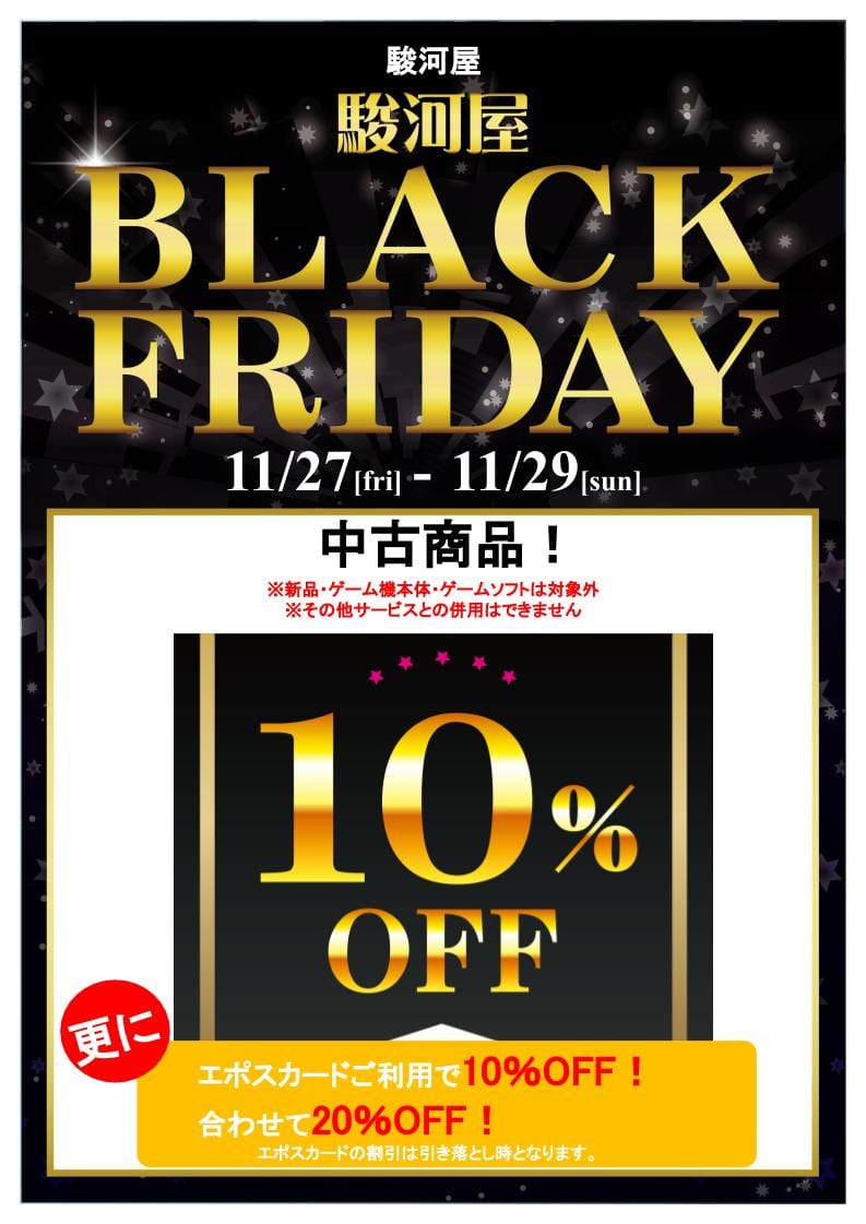 【駿河屋】実店舗「ブラックフライデーセール」明日開催、中古商品が全品10%OFF!マルイ店舗なら更に10%OFFの計20%OFF 2020年11月26日 22:53 News駿河屋 コメ 実店舗セール この記事の続きを読む