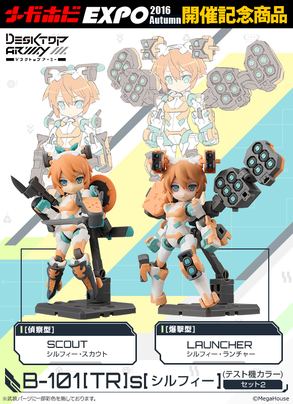 【メガホビEXPO開催記念商品】「デスクトップアーミー B-101[TR]s シルフィー(テスト機カラー)セット2」ほか受注開始 2016年11月26日 12:12 可動フィギュアメガハウス限定メガホビ コメ イベント開催記念商品 この記事の続きを読む