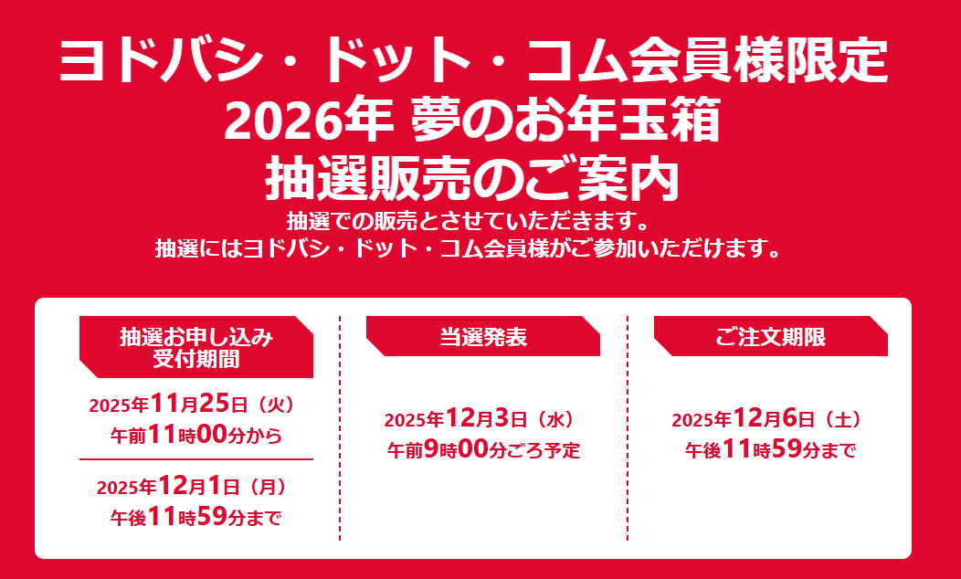 【ガンプラ福箱】ヨドバシ「2026年 夢のお年玉箱」【2次受付 結果発表】 2025年12月09日 22:16 ガンダムNewsヨドバシ福箱抽選プラモ福箱ガンプラ コメ 【2次受付 結果発表】 この記事の続きを読む